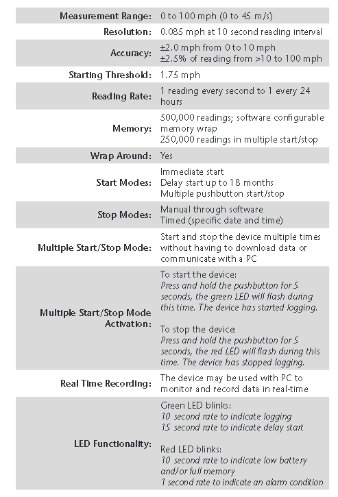Maximum Measurable Speed 100 mph (contact factory about use at higher wind speeds)